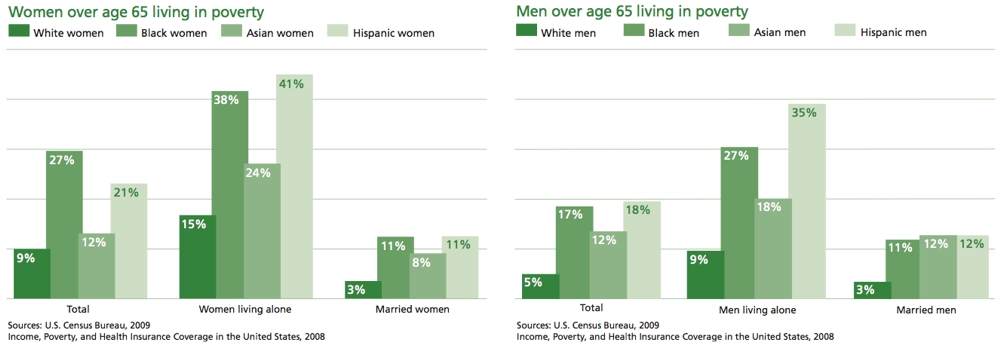 To add another dimension to the commune idea, Amanda Scarbrough sent me an article about poverty among elders. In this article the author, Deborah Carr (2010), says, “Poverty rates among older adults range from just 3.1 percent among white married men to an astounding 37.5 percent for black women who live alone and 40.5 percent for Hispanic women living alone. How can we make sense of the fact that overall elderly poverty levels have dropped precipitously over the past four decades, while some subgroups of older adults remain at great risk of impoverishment? She goes on to discuss the possible reasons for higher rates of poverty for single women, but there is an interesting observation to note from looking at two of the graphs she includes in her article. See below.